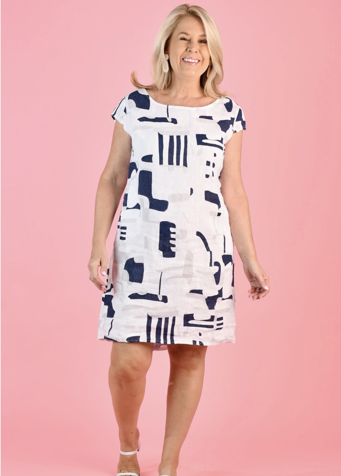 The Emilia Shift Dress in Geometric White print is a charming and breathable piece made from 100% Italian Linen.