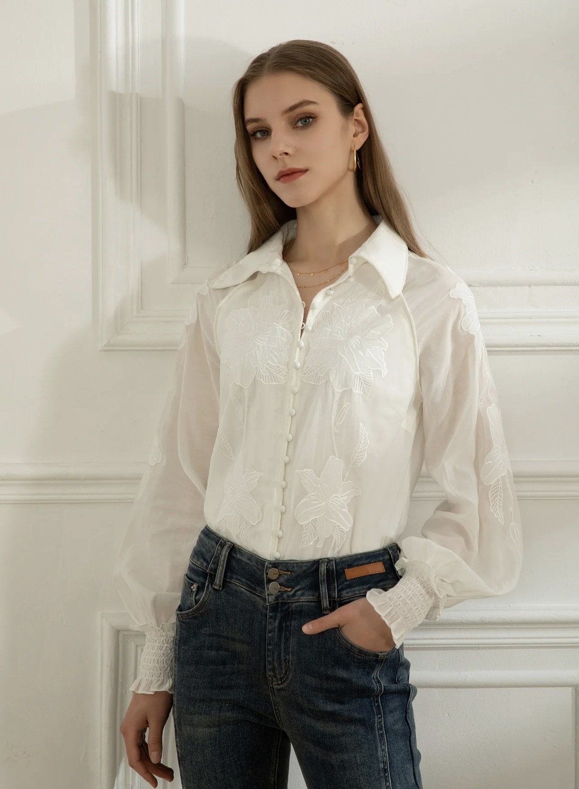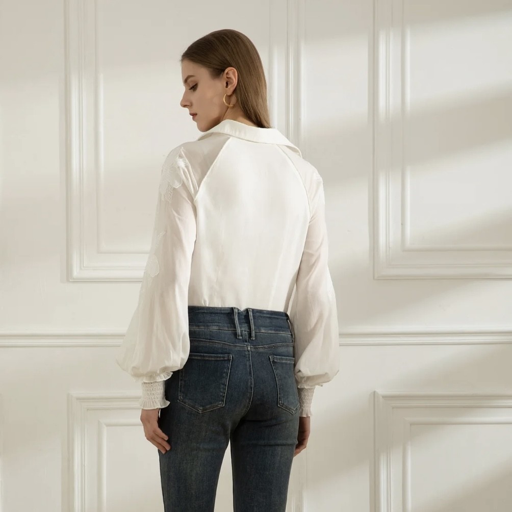 This is a relaxed romantic blouse.  Fabric covered buttons, structured collar with piping trim, detailed embroidered flowers and piping trim throughout.
