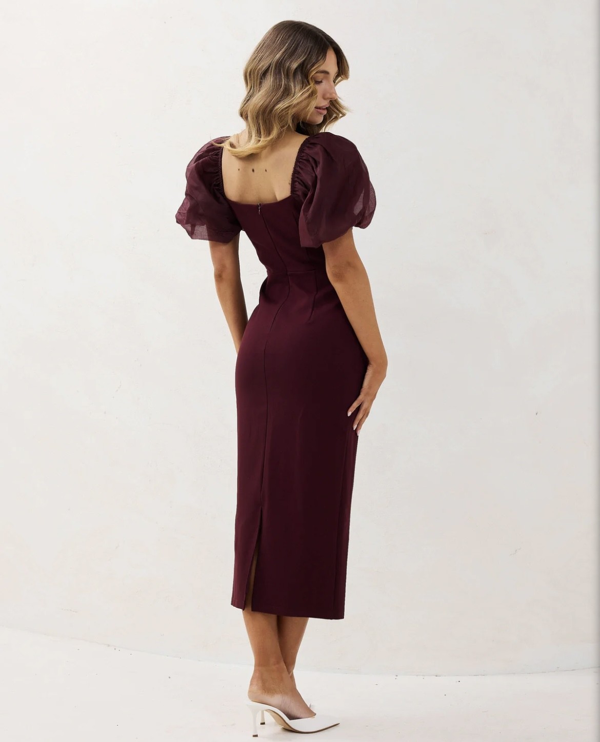 This dress in an enchanting body wrap dress that features a sheer puffy sleeve. It is a versatile piece that you can feel stylish and comfortable in with a soft fabric that caresses your skin. The cross-over bodice adds a touch of allure. This dress is an elegant choice for any occasion, exuding sophistication and grace with every wear.