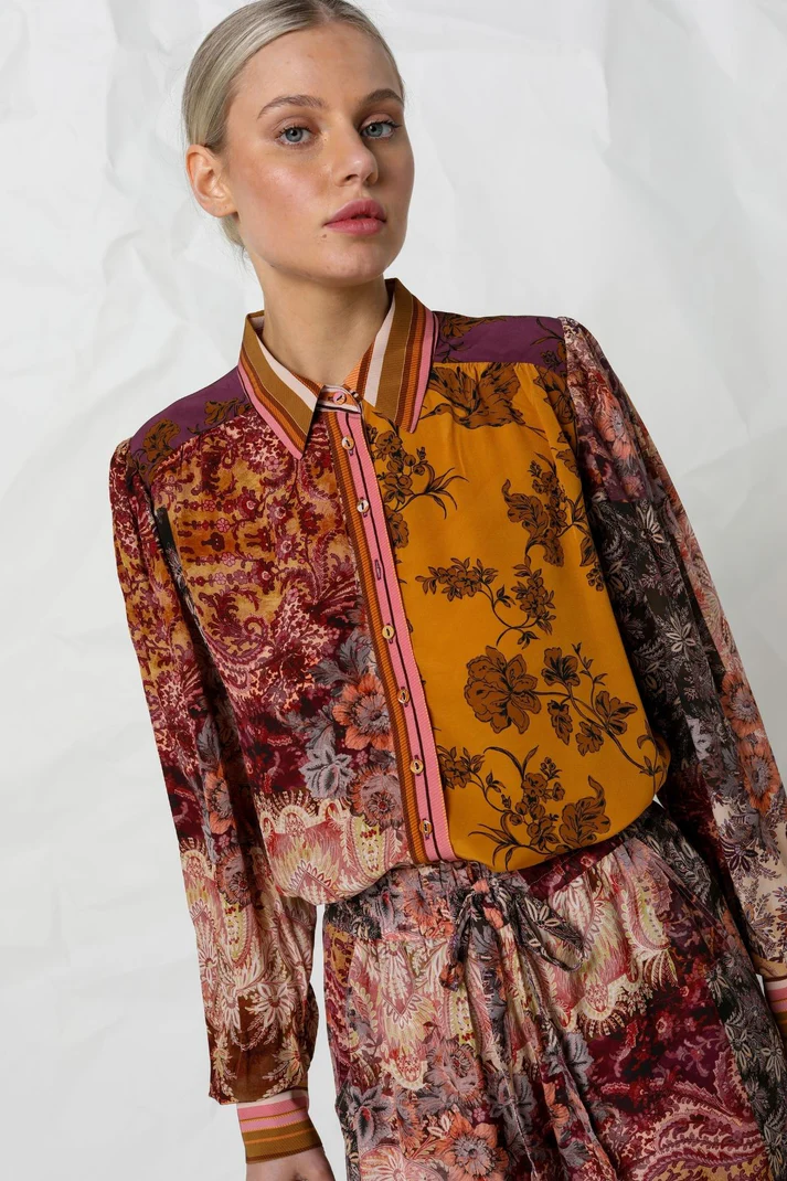 The Sage Shirt by KACHEL, paired with the Addison Pant – A striking blouse featuring vibrant orange-red hues and a beautiful floral pattern. This shirt combines bold colour with timeless style, featuring long sleeves, a classic collar, and a button-down design.
