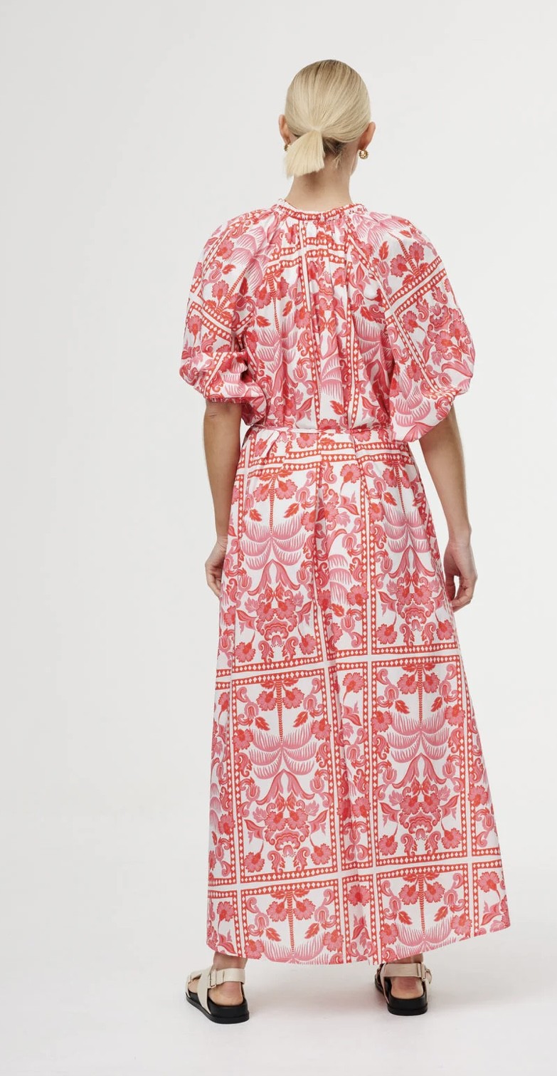 This dress is a light, loose fitting maxi style with balloon sleeves, collar tie details and buttons that run the length of the dress.