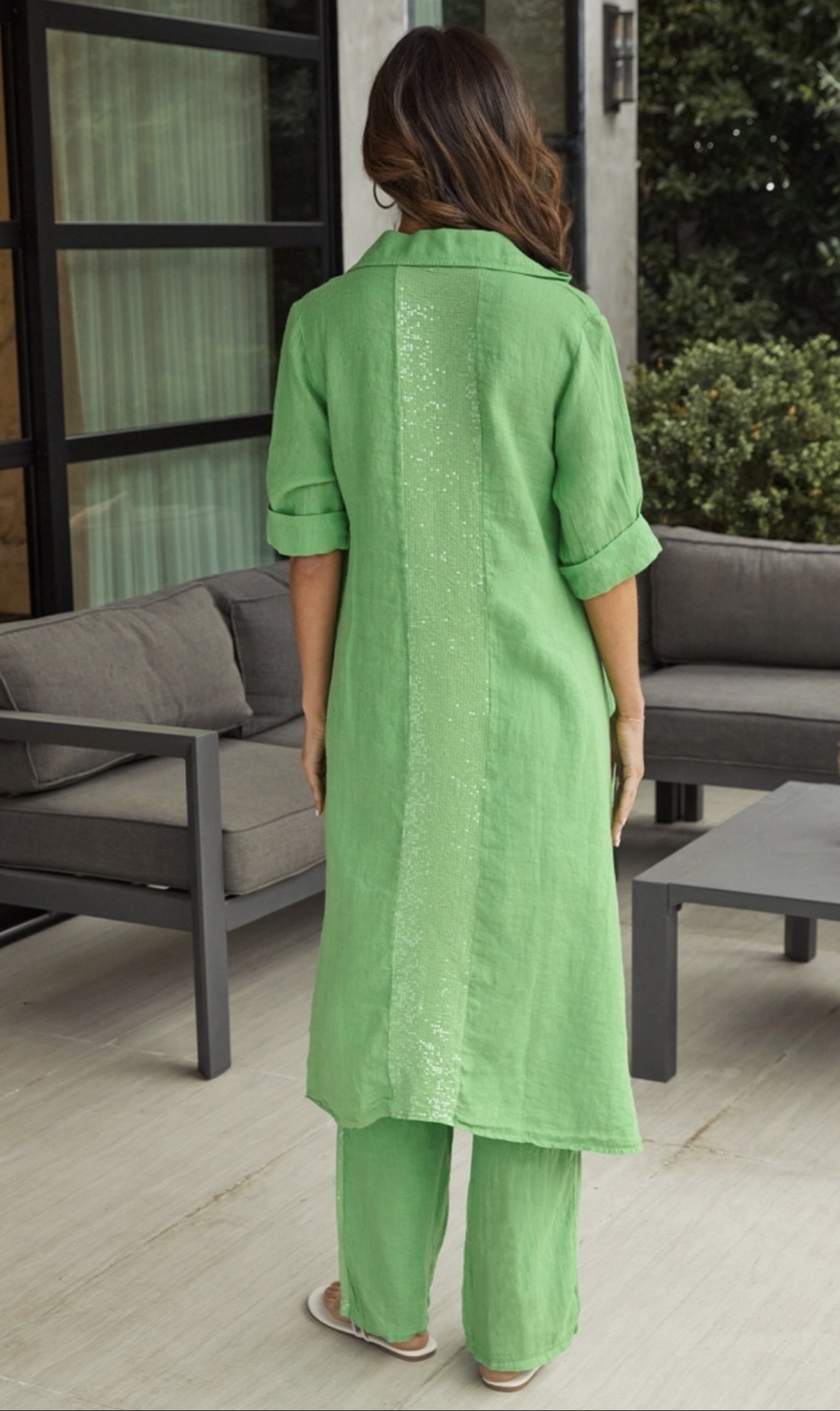 Italian Linen high-low button-down sequin shirt. Boasting an eye-catching Italian linen fabric, this high-low button-down shirt is adorned with sequin trim detail and sequin front pocket for a sophisticated touch. The versatile design can be worn as a dress or styled with pants for a unique look. The classic collar adds a timeless appeal and makes it perfect for any occasion.
