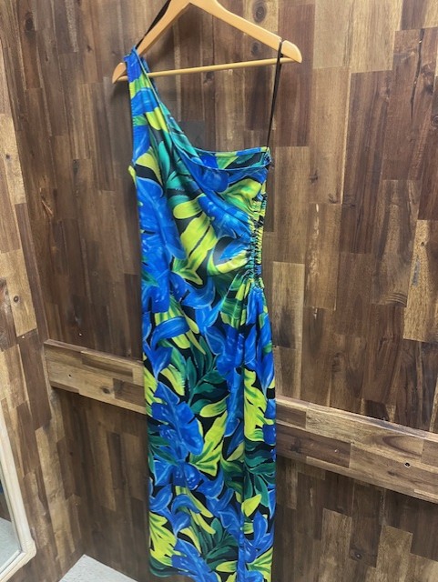 Asymmetrical neckline with thick straps. Cut out at side waist with elastic. High leg split and maxi length.