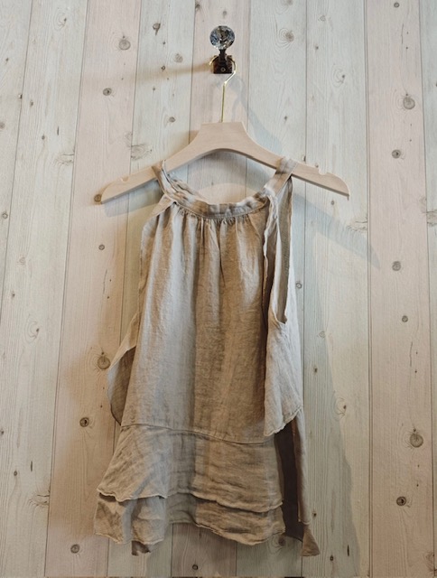 Strap tie-neck blouse. Measurements approx: 62 cm long and 50 cm wide.  Perfect for those comfy jeans or just match them with a pair of linen pants.